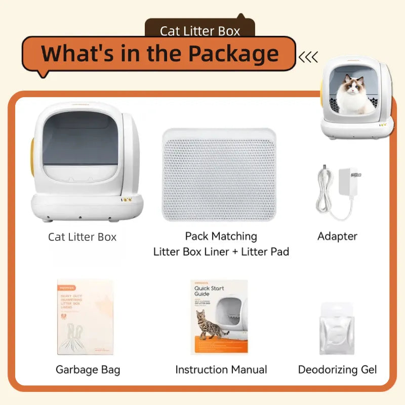 Each package includes automatic litter box*1, cat litter mat*1, litter box liner*1, deodorant gel*1, adapter*1, instruction manual*1