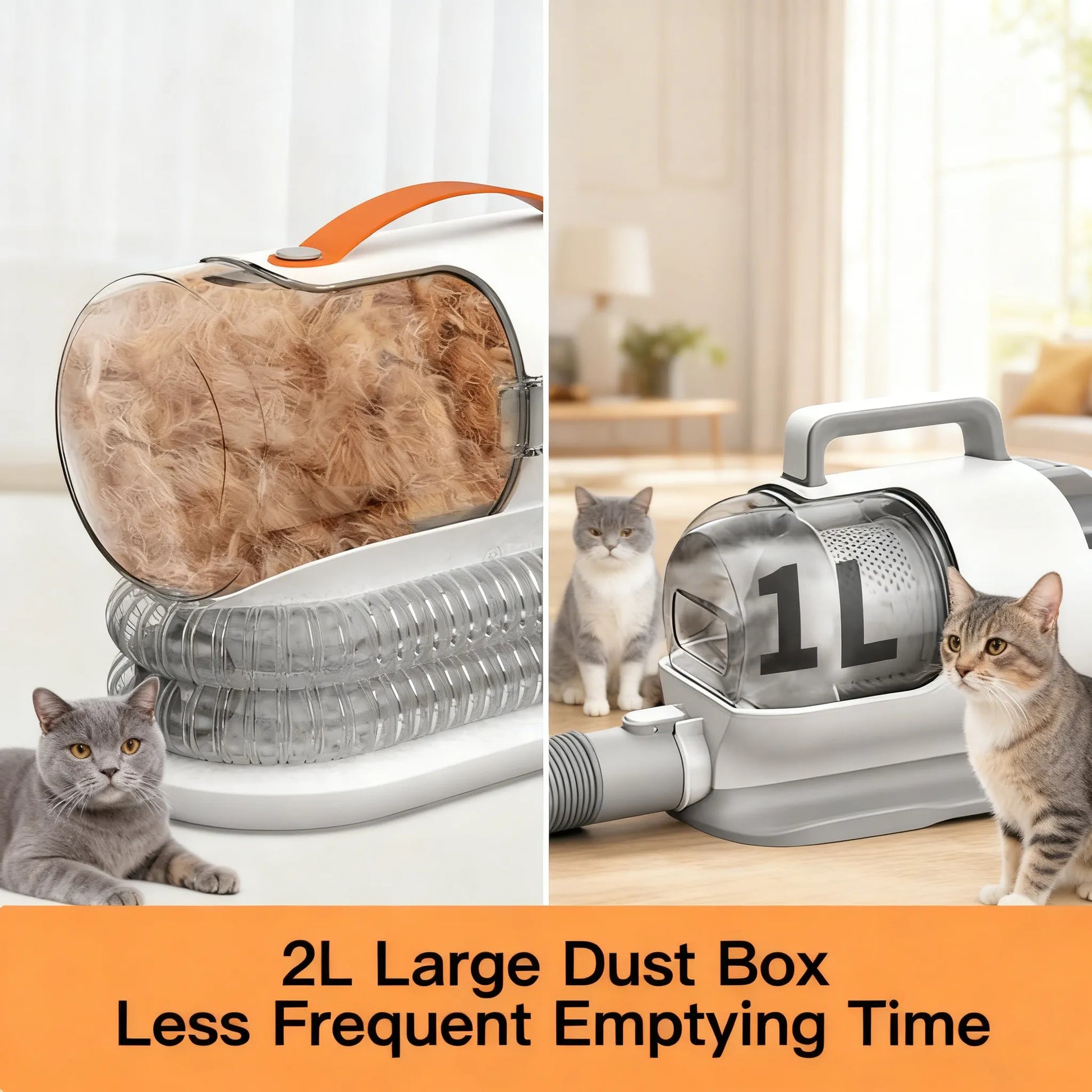 Grooming large dogs or multiple pets no longer means constant stops to empty the dust bin. Our grooming vacuum comes with a spacious dust cup that holds plenty of fur, so you can finish an entire grooming session without interruptions. When it’s time to empty, simply press the quick-release button—no touching dirty hair required! The dust cup detaches easily and empties cleanly into the trash, making post-grooming cleanup just as easy as the grooming itself.