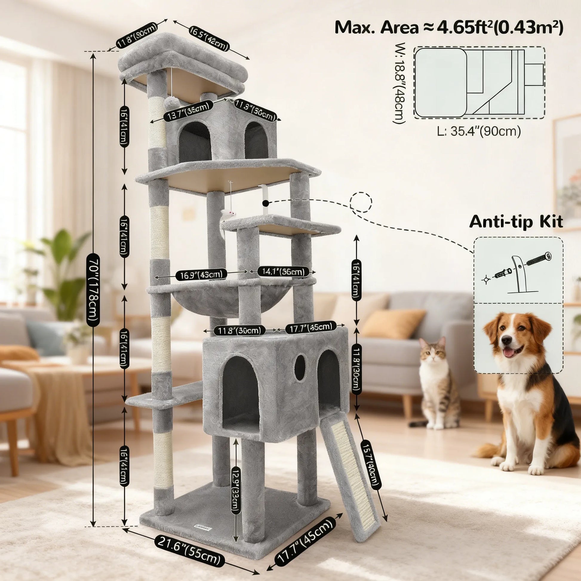 At 70 inches (approximately 180 cm) tall, our cat tree gives your cat the elevated vantage point they crave—cats love to climb high to observe their territory! The extra-large top platform offers a spacious area for your cat to rest, sunbathe, or keep an eye on every corner of your home. Best of all, the top platform is removable, making cleaning and maintenance a breeze. Simply take it off to wipe away fur, spills, or debris, ensuring a clean and hygienic space for your cat. No more struggling to reach tight corners or clean hard-to-access areas!