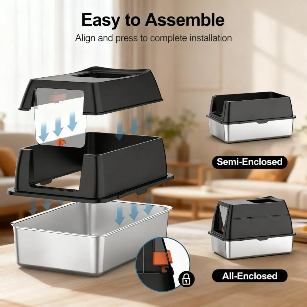 Our stainless steel litter box features an easily assembled modular system that offers both enclosed and semi-enclosed configurations to meet diverse needs. The enclosed setup provides your cat with private space while effectively containing litter scatter and trapping odors—keeping your home fresh and clean. For cats that prefer more open space, the semi-enclosed option is perfect, and it also simplifies cleaning for you by allowing easy access to the litter area. No more choosing between your cat’s comfort and your convenience—this design has it all.